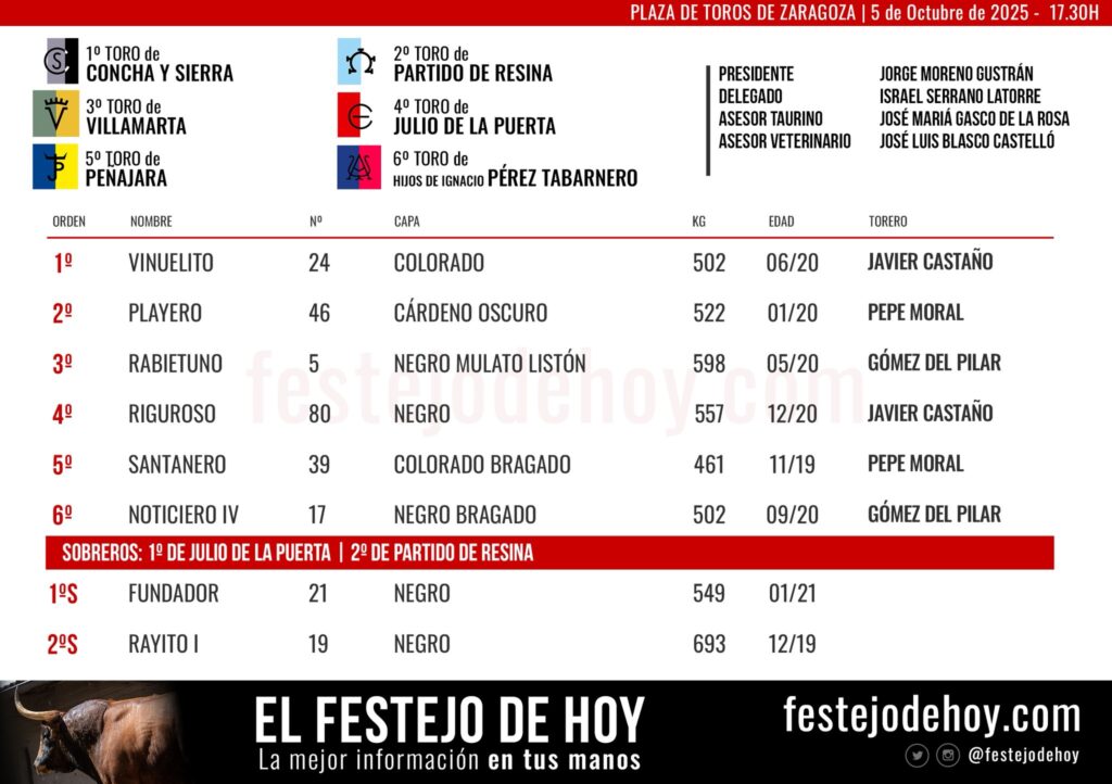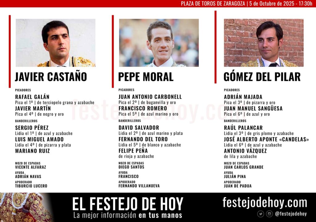 Corrida Concurso de Ganaderías. Se lidian toros de Concha y Sierra, Partido de Resina, Villamarta, Julio de la Puerta, Peñajara y Pérez Tabernero para los diestros Javier Castaño, Pepe Moral y Gómez del Pilar.