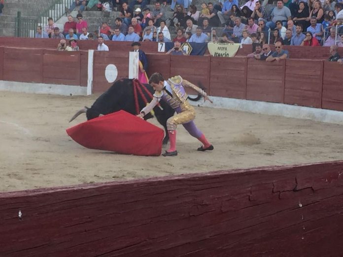Esperando a su torero local, Ignacio Olmos. Vestido con un terno de lila y oro, recibió a su primer novillo a porta gayola. Era un todo o nada, pues se jugaba mucho en su segunda novillada de la temporada. Con gesto serio y sereno, comenzó la faena por verónicas ajustadas, terminando con una media.